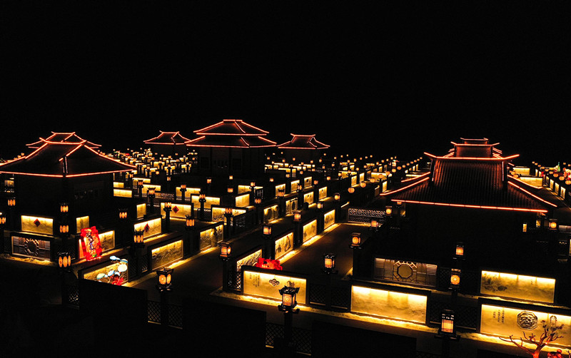 据了解,九曲黄河灯阵长约4.5公里,中间为紫禁城,其余八城按照八卦方位排列,散布紫禁城周遭。