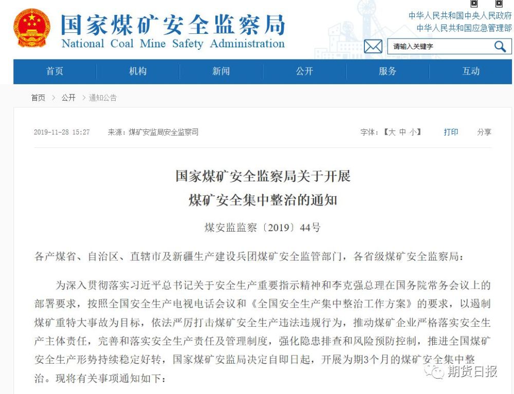 近期煤炭行业事故频发。从10月22日至今,已有六起事故发生,共造成26人死亡。上周一,11家大型动力煤企业联合发出倡议:不安全不生产;国家煤矿安监局网站上周四发布《国家煤矿安全监察局关于开展煤矿安全集中整治的通知》(以下简称《通知》),决定自即日起,开展为期3个月的煤矿安全集中整治。随后上周五收盘黑色系走升,动力煤涨逾1%。进入12月,动力煤和焦煤焦炭在安检趋严的环境下会“高奏凯歌”吗?