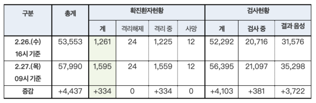 韩国中央防疫对策本部2月27日通报说,截至当天上午9时,韩国较昨日新增334例新冠病毒感染病例,累计确诊1595例,死亡12例,治愈24例。