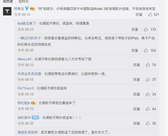 消息发出后,对特斯拉频繁调价,已预订和购车用户表示非常“激动”。在评论区,不少用户表示“长续航不降价就退车”。