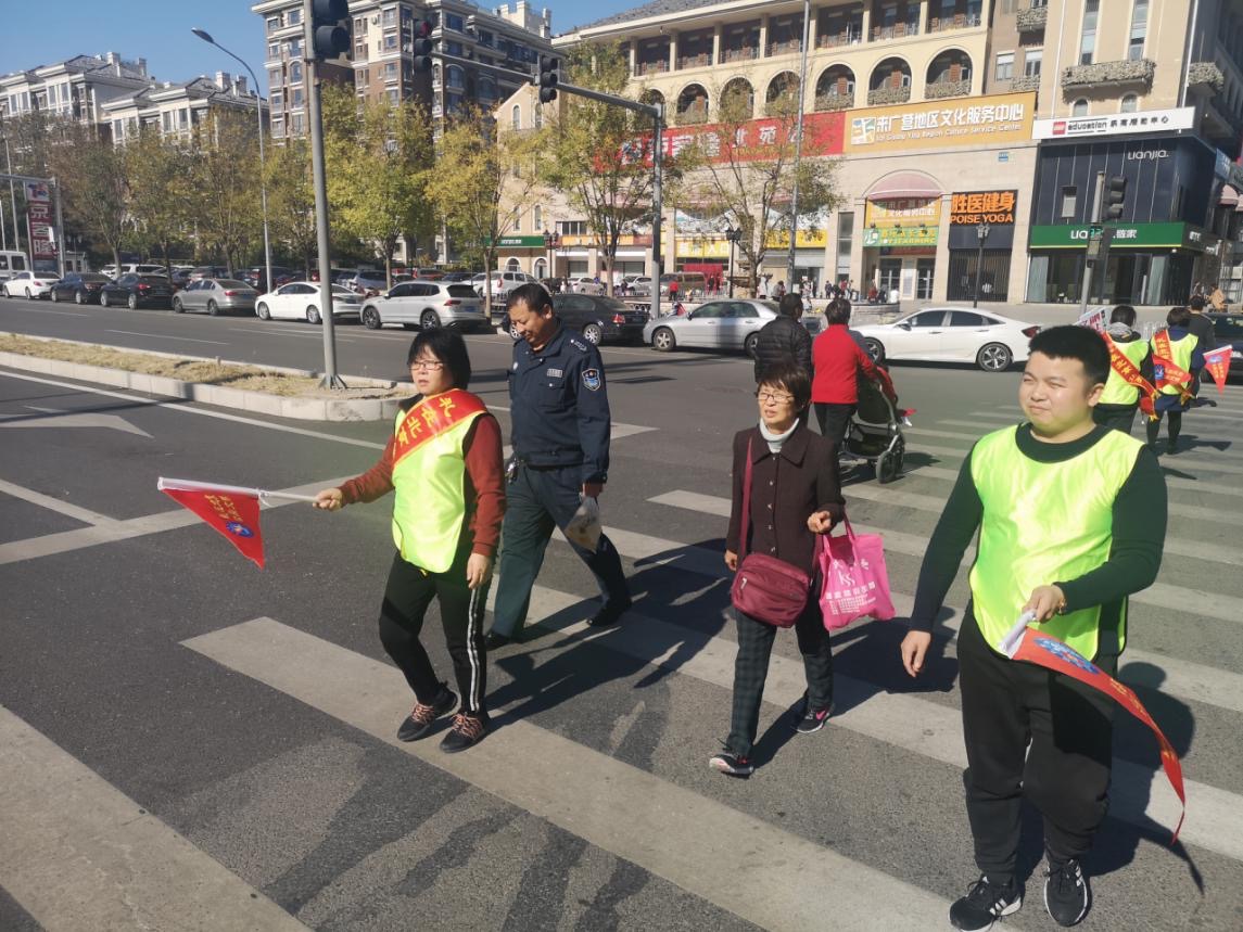 志愿者在春华路与秋实街交叉口引导行人过马路