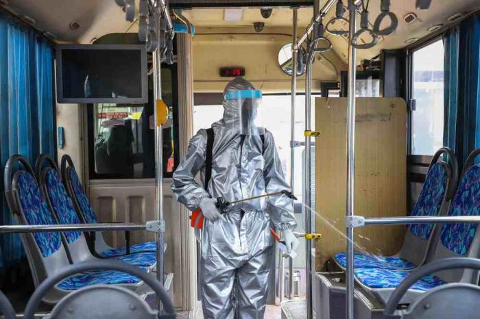 8月24日,在埃塞俄比亚首都亚的斯亚贝巴,工作人员对公交车进行消毒。 据埃塞俄比亚卫生部24日发布的数据显示,该国累计新冠确诊病例达42143例。