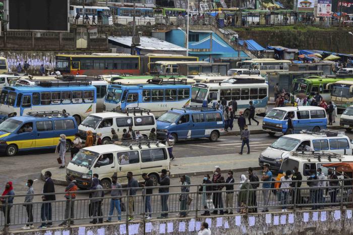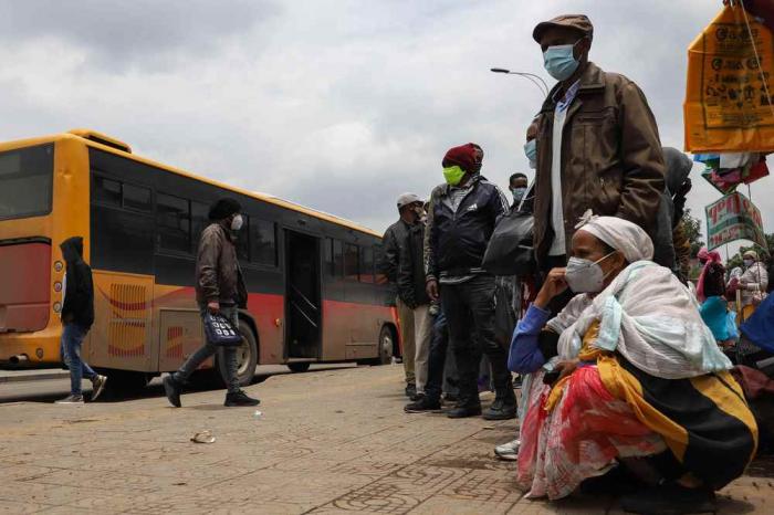8月24日,在埃塞俄比亚首都亚的斯亚贝巴一处较为繁忙的公交枢纽中心,民众戴着口罩等待公交车。