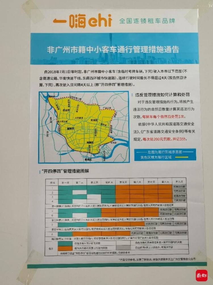 在门店内,南都记者注意到墙上贴着“非广州市籍中小客车通行管理措施通告”,详细介绍了“开四停四”管理措施、限行区域、违章处罚等内容。前台和进门处装有两个摄像头,门店外的空地停放着多量待租车辆。