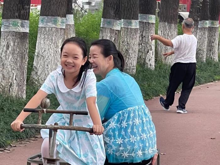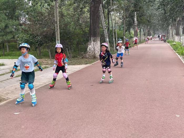 8月22日,在运潮减河边的树林里轮滑的孩子们。