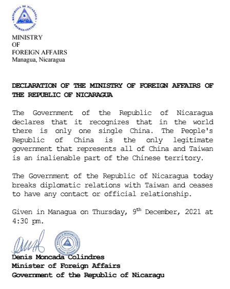 △尼加拉瓜外交部12月9日下午发表声明,宣布与台湾断绝“外交关系”