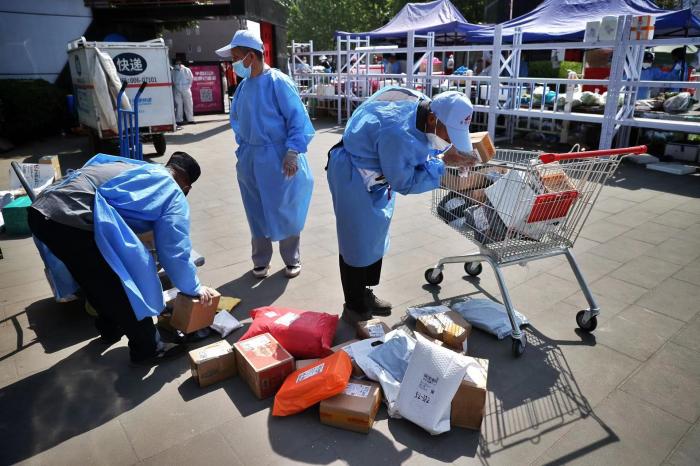 5月5日,在通州州Bobo自由城西门外,物业的工作人员对快递进行消杀。