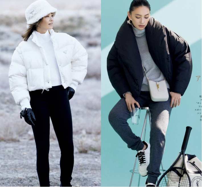 可以先介绍最为保暖的白色羽绒服,它显得蓬松又轻盈,以短款的样式为主,搭配黑色长裤,更能衬托出修长的身姿。
