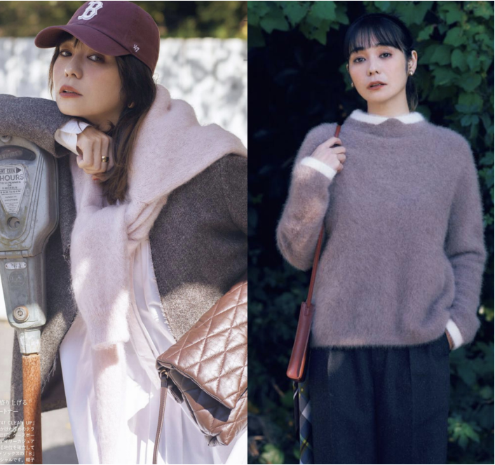 好比这两件毛衣,它们的颜色就偏素雅温柔,因此毛衣呈现出来的视觉攻击性不算太强的类型,甚至会显得平淡了一些。但对于普通人来说,这样的服装刚刚好,可以形成没有太多驾驭压力的造型。