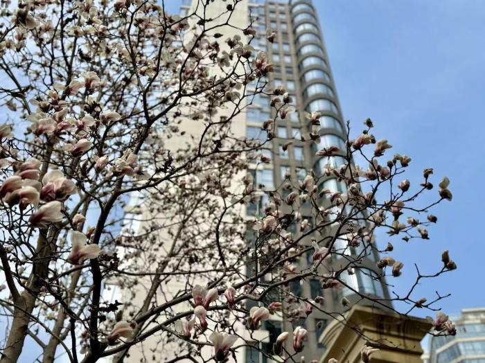 步道旁,几株玉兰树舒展着虬劲的枝桠,花苞次第绽放。