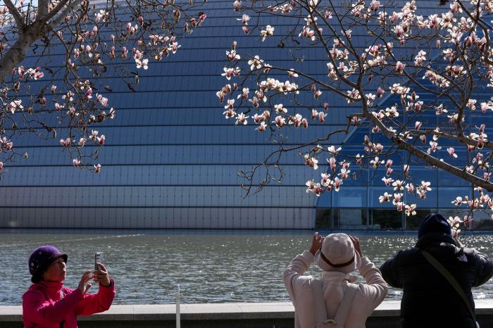 3月9日,游客在国家大剧院旁欣赏盛开的玉兰花。