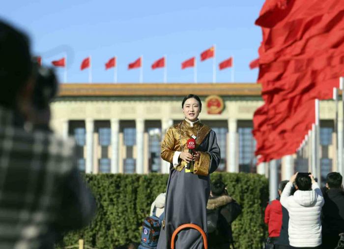 记者在闭幕会前录制报道节目。
