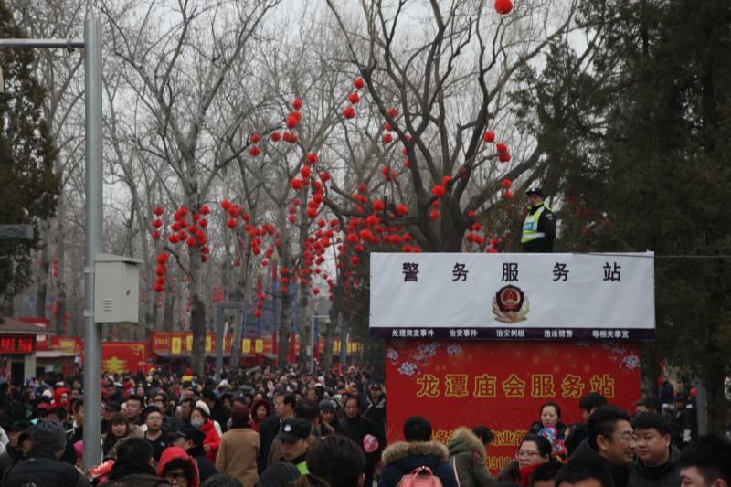 为保障两大庙会安全秩序,东城警方分设指挥部组织600余名警力投入安保工作,同时对两大庙会实行最大客流限制,其中同一时间地坛超过11万人,龙潭超过9万人将停止售票入园。