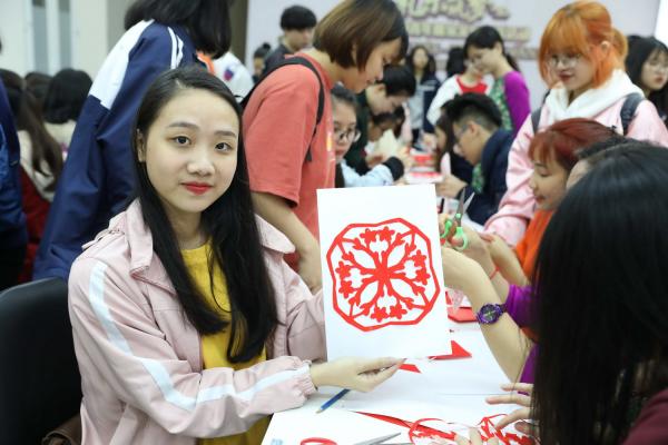 3月24日,在越南首都河内,一名参与者在“礼乐筑梦”中越青年儒家文化交流活动上展示刚刚完成的剪纸作品。
