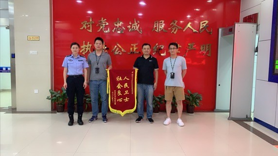 从接到报警,到抓获嫌疑人,再到追回车辆,三天时间,宝安警方日夜兼程,跨越三座城市,只为尽快帮被骗事主追回失车。在追回车辆后,陈先生也到深圳市公安局宝安分局镇南派出所,将一面印有“人民卫士 社会良心”字样的锦旗送到民警吴伟杰等人手中。