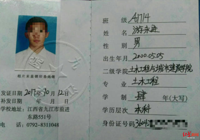 游国华提供的一份盖有九江学院土木工程与城市建设学院印章的《在校证明》上显示,游永进的专业是土木工程,在校期间表现优异,成绩排名前列,是一位品学兼优的大学生。
