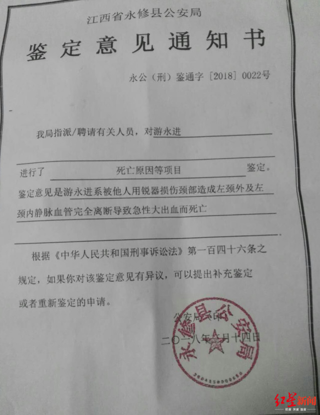 据鉴定,游永进全身多处表皮剥脱,皮下出血,共见七处创口,主要损伤于颈部。经鉴定,游永进是被他人用锐器损伤颈部造成左颈外静脉与左颈内静脉血管完全离断导致急性大出血而死亡。