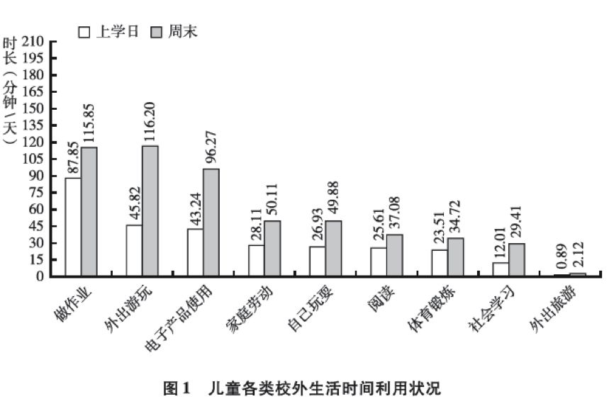 蓝皮书调查显示,在上学日,平均每个儿童的校外生活时间分配中,花费时间最多的类别是做作业(包括学校作业、课外班作业、家长布置的作业、其他作业),占时87.85分钟(其中学校作业平均占时62分钟)。其次是外出游玩(45.82分钟),其中,占时最多的是去公园、小区露天场所等公共场所(18.59分钟)。再次是电子产品使用时间(43.24分钟),其中,利用电子产品娱乐时间(包括抖音、动画片、快手等)最长(16.60分钟),进行学习(包括电子书、App学习、网络课程等)的时间为13.90分钟,利用电子产品玩游戏、网络聊天(包括网络游戏、QQ、微博、微信等)的时间为12.75分钟。