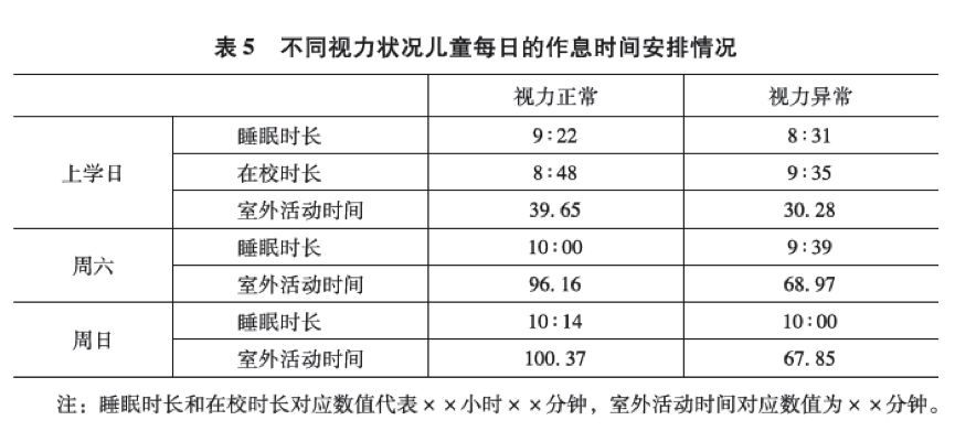 但是,电子产品的过度使用并不利于儿童的身心健康。调查显示,使用电子产品时间越长的儿童,其社交技能得分、抗逆力得分越低,近视程度越高。虽然有研究表明使用电子产品并不是导致儿童视力下降的直接因素,户外活动对儿童视力的影响更大,但是电子产品对儿童的吸引力如此之大,必然会占据儿童其他校外生活的时间,尤其是室外活动时间。调查发现,幼儿园儿童在上学日的室外活动时间最长,为48.31分钟;小学二、四年级学生的室外活动时间为36.48分钟;小学六年级学生的室外活动时间为37.78分钟,初中生的室外活动时间为24.62分钟。这表明,随着学段的增长,儿童室外活动时间逐渐减少。如前所述,视力正常儿童的室外活动时间多于视力异常儿童,间接佐证了室外活动时间、电子产品使用时间会影响儿童的视力。