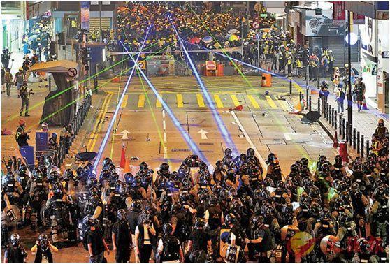 暴徒常联群结队以镭射笔照射警员(图片来源:香港《文汇报》)