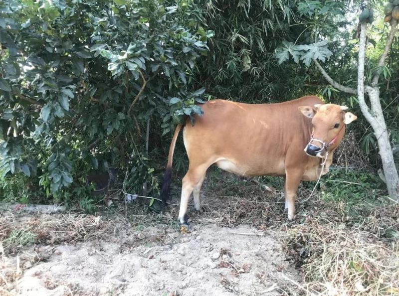 民警立即出动,同四名巡逻队员沿路寻找母牛。功夫不负有心人。经过一个多小时的寻找, 终于在邱下金丘加油站的附近后山找到了正屁颠屁颠溜达着的“调皮”母牛。