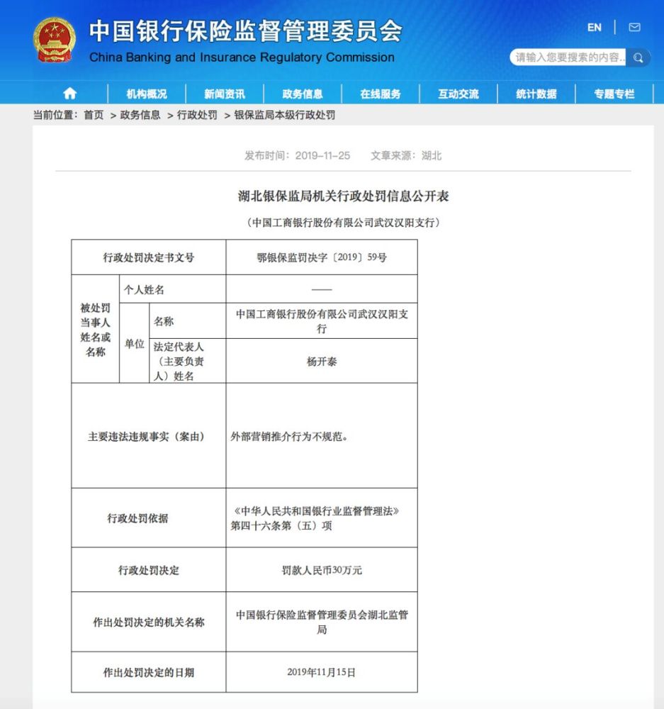 值得一提的是,厮杀疯狂的领域也容易出幺蛾子。11月25日,湖北银保监局披露了3张行政处罚单,其中一张罚单的当事银行因外部营销推介行为不规范,被罚30万元。湖北银保监局作出行政处罚决定书的时间为11月15日。