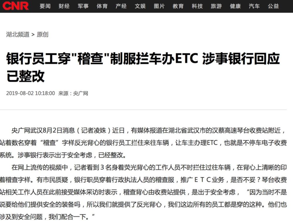 据了解,这张罚单的背后,正是今年夏季当事银行员工穿印有“稽查”字样反光背心在汉蔡高速琴台收费站前拦车办ETC的事件。