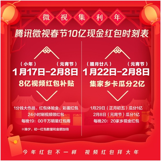 1月15日,腾讯微视正式公布2020年春节红包活动方案,在去年的基础上,微视升级视频红包玩法。从小年到元宵节,微视将联合新华社、人民网等权威媒体,邓伦、迪丽热巴、《囧妈》导演/主演徐峥、TFBOYS、肖战、杨超越、杨幂、易烊千玺等百余位明星,OPPO、可口可乐、中国联通、长安欧尚、碧桂园等品牌,推出个人视频红包、明星红包雨、集家乡卡等多重玩法。