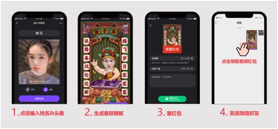 在春节期间,微视视频红包还为用户准备了三大类近100种玩法,全方位满足不同场景下各类用户的需求,例如新年炮竹、“3D财神爷来也”、“我想开了”。其中的智能AI春联,就对藏头春联创作又进行了一次全方面的技术升级,通过腾讯AILab自研的文本生成算法使得生成的春联读起来更加自然顺畅,更接地气的同时也能体现满满新春情怀。