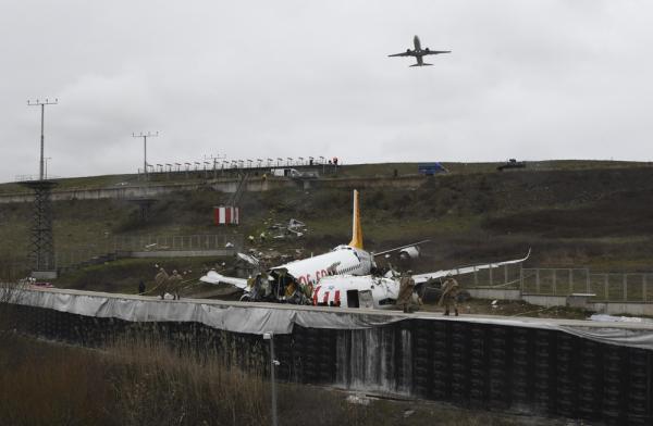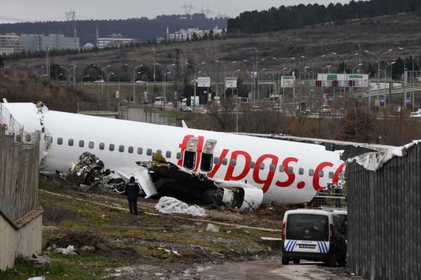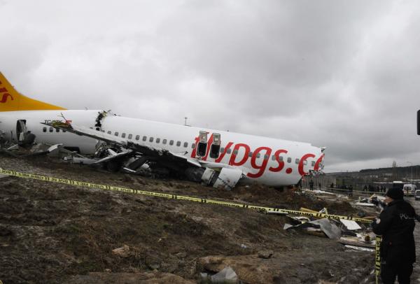 2月6日,土耳其伊斯坦布尔萨比哈·格克琴机场拍摄的客机降落滑出跑道事故现场。这架客机5日下午从土西部城市伊兹密尔起飞,在伊斯坦布尔萨比哈·格克琴机场降落时滑出跑道,机身严重损坏。事故造成3人丧生、180人受伤。