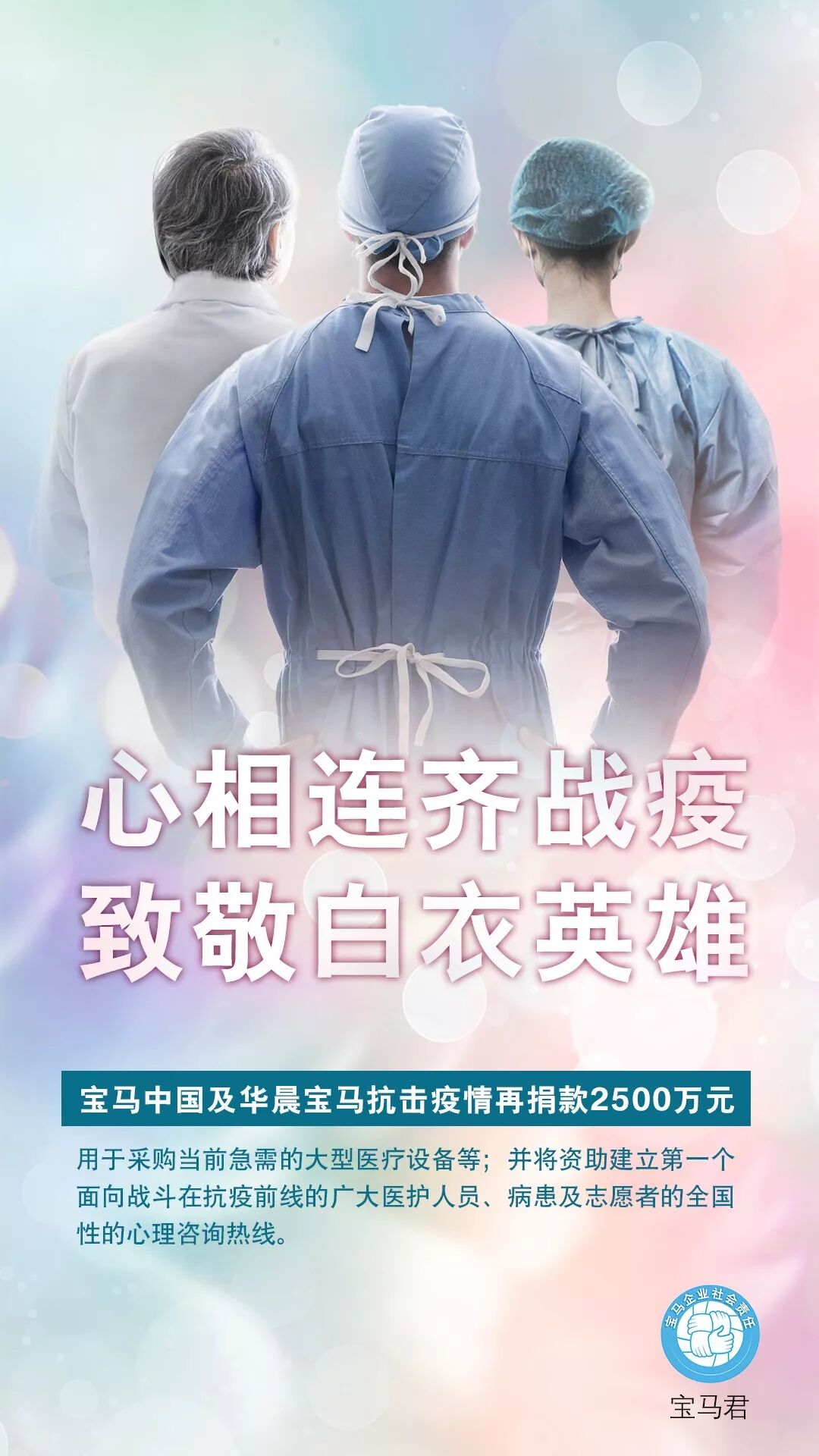宝马集团大中华区总裁兼首席执行官高乐先生,及华晨宝马汽车有限公司总裁兼首席执行官魏岚德博士,共同表示:“宝马在华企业所有员工、全国经销商、合作伙伴,向那些每天冒着生命危险保护我们、艰苦奋战在抗疫一线的广大医护人员致以最崇高的敬意!他们做着不平凡的事情,他们是抗击疫情逆行而上的英雄。作为中国社会的一分子,我们向他们致敬,我们与中国人民在一起!我们坚信,中国人民必将成功应对这史无前例的严峻挑战。我们坚信,中国政府与中国社会各界心相连、齐战疫,这个伟大的国家必将战胜疫情。”