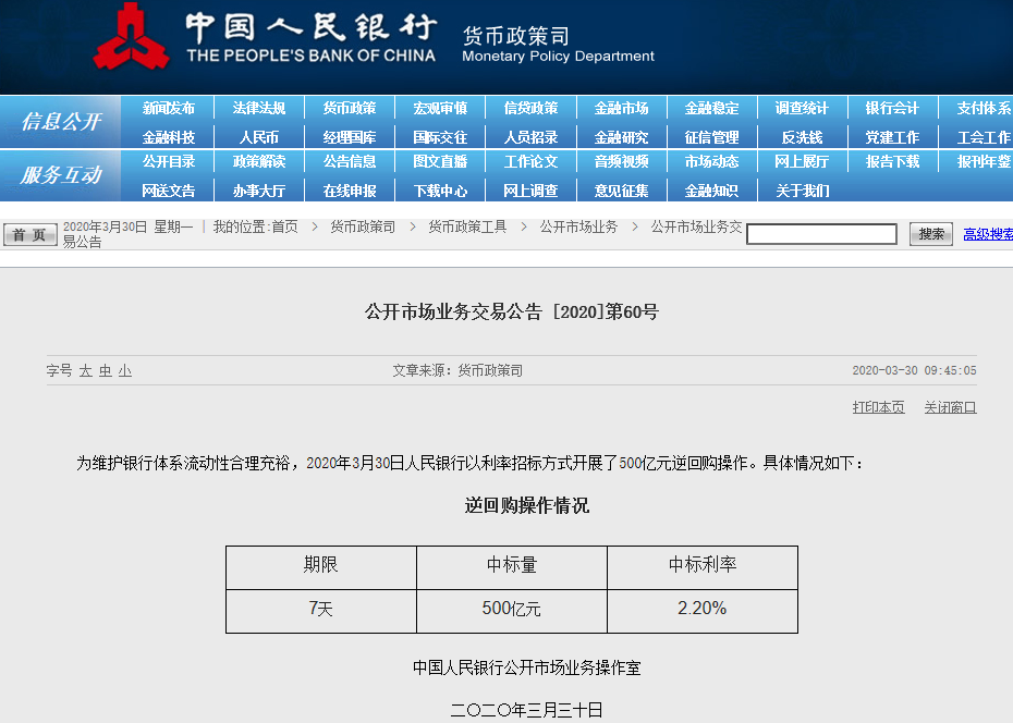 3月30日,央行下调7天期逆回购利率20个基点。值得注意的是,为应对疫情影响,今年2月初央行先行下调逆回购利率10个基点,当月中期借贷利率(MLF)随后同幅下调,进而带动2月贷款市场报价利率(LPR)下调。