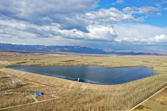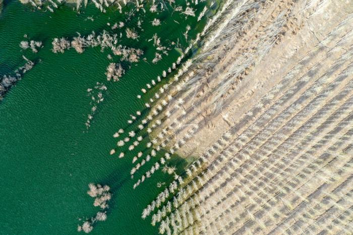 4月19日拍摄的阿勒泰市中水库一角(无人机照片)。从2017年至今,阿勒泰市中水回用环境治理示范园已为当地绿化工程提供40万株树苗,实现5000亩荒山绿化。