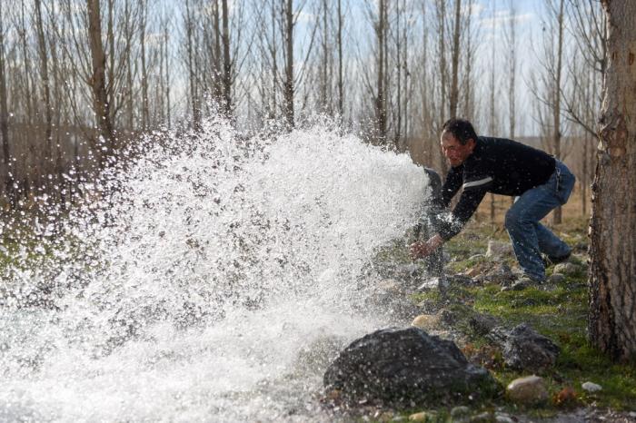 4月19日,在阿勒泰市中水回用环境治理示范园,工人放水灌溉苗木。近年来,新疆阿勒泰市利用经污水处理厂处理达标后的中水,灌溉建在戈壁滩上的苗圃基地,形成良性循环,助力绿化工程,改善生态环境。