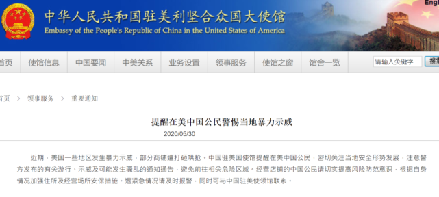 5月30日,中国驻美大使馆发布重要通知,提醒在美中国公民警惕当地暴力示威。