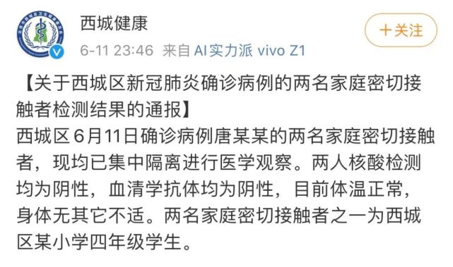 西城区卫健委官方微博“西城健康”刚刚发布消息:西城区6月11日确诊病例唐某某的两名家庭密切接触者,现均已集中隔离进行医学观察。两人核酸检测均为阴性,血清学抗体均为阴性,目前体温正常,身体无其它不适。两名家庭密切接触者之一为西城区某小学四年级学生。