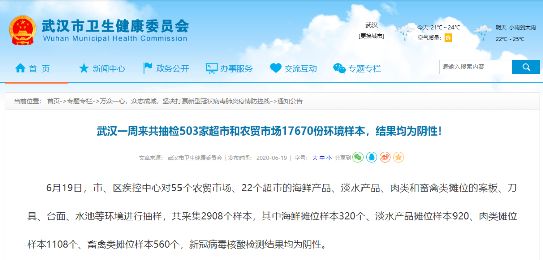 6月19日,武汉市、区疾控中心对55个农贸市场、22个超市的海鲜产品、淡水产品、肉类和畜禽类摊位的案板、刀具、台面、水池等环境进行抽样,共采集2908个样本,其中海鲜摊位样本320个、淡水产品摊位样本920、肉类摊位样本1108个、畜禽类摊位样本560个,新冠病毒核酸检测结果均为阴性。