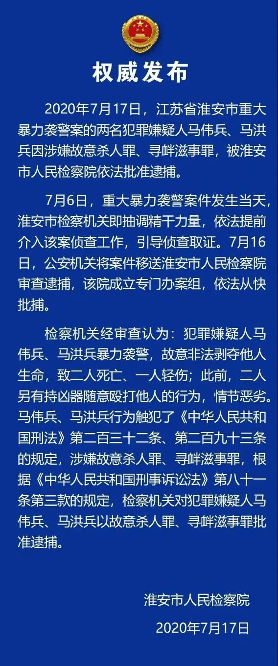 7月17日,淮安市人民检察院发布消息称,淮安市重大暴力袭警案的两名犯罪嫌疑人马伟兵、马洪兵因涉嫌故意杀人罪、寻衅滋事罪,被淮安市人民检察院依法批准逮捕。