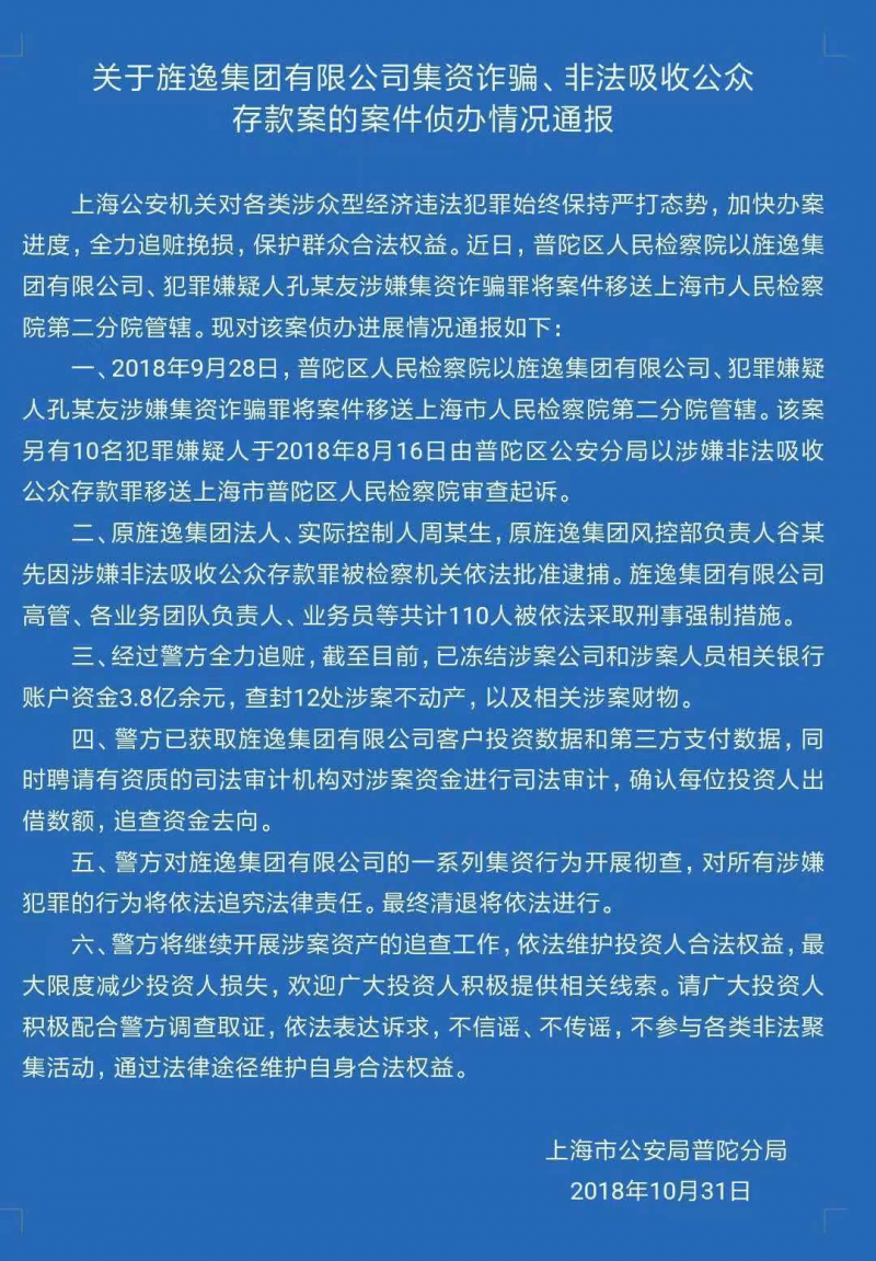 2018年10月31日,上海市公安局普陀分局发布的案件侦办情况通报显示,旌逸集团、孔某友涉嫌集资诈骗罪被移送上海市人民检察院第二分院管辖。旌逸集团高管、各业务团队负责人、业务员等共计110人被依法采取刑事强制措施。警方已冻结涉案公司和涉案人员相关银行账户资金3.8亿余元。