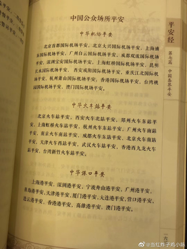 在第七篇“中国各界平安”之“中国公众场所平安”章节中,作者列举了北京首都国际机场、上海普通国际机场等14个机场,北京火车站等13个火车站,上海港等13个港口。在各个机场、火车站、港口名后,全部加上了“平安”二字。