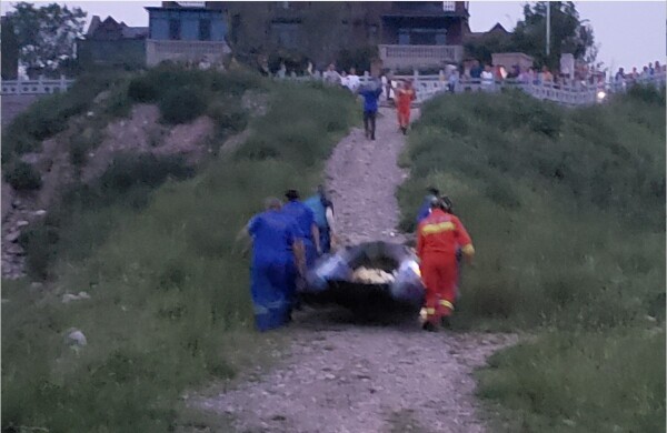 蓝天队员配合消防指战员利用冲锋舟进行打捞搜救,14时51分,救援人员将溺水男子打捞上岸并交与120急救医护人员,经确认,男子已无生命体征。