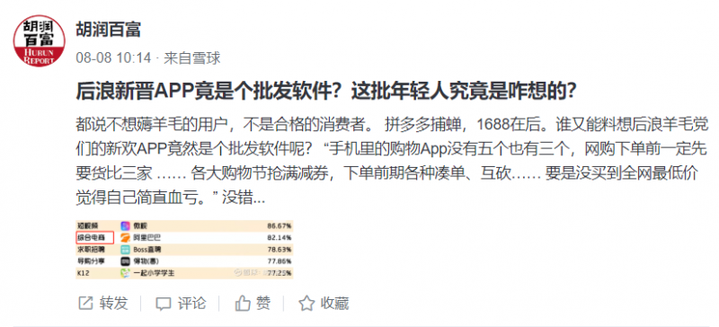 “后浪新晋APP竟是个批发软件?这批年轻人究竟是咋想的?”胡润百富文章称,“一场1688的批发式购物大风刮起来了,一举击破羊毛党的心理防线。据统计,1688已经成为今年上半年APP增长最快的快综合电商。”