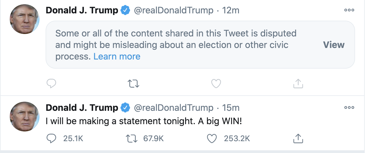 此后,推特已删除“偷走大选”相关推文,并标注:“这条推文中分享的部分或全部内容是有争议的,可能会误导选举或其他公民程序。”
