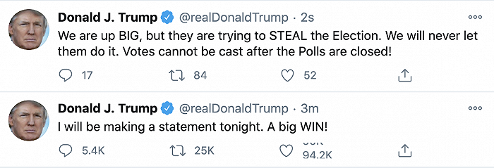 特朗普称会“大举获胜”、不让对方“偷走大选”后,推文被删除