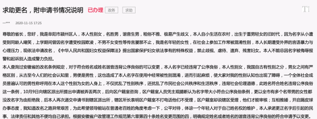 据领导留言板显示,11月15日,安徽阜阳市颍州区一女子自称名胜男,谐音“生男”,该女子称,她自小生活在农村,出生于重男轻女的旧时代,因为名字从小遭受到同龄人嘲笑,上学期间曾因名字遭受校园欺凌,不男不女变性等传言屡禁不止。女子称,“我是名年轻的女性,在社会上参加工作常被混淆性别,本人长期遭受外界的言语暴力与心理压力,现依法申请改名。”