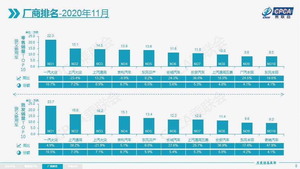 一汽-大众、上汽大众与上汽通用依然位居前三名。不过南北大众的差距正在不断扩大,数据显示,一汽-大众11月份零售量为22.3万辆,同比增长7.9%,而上汽大众再次两位数下滑,11月零售量同比下滑23.4%至15.1万辆,这也是上汽大众连续11个月同比下滑。