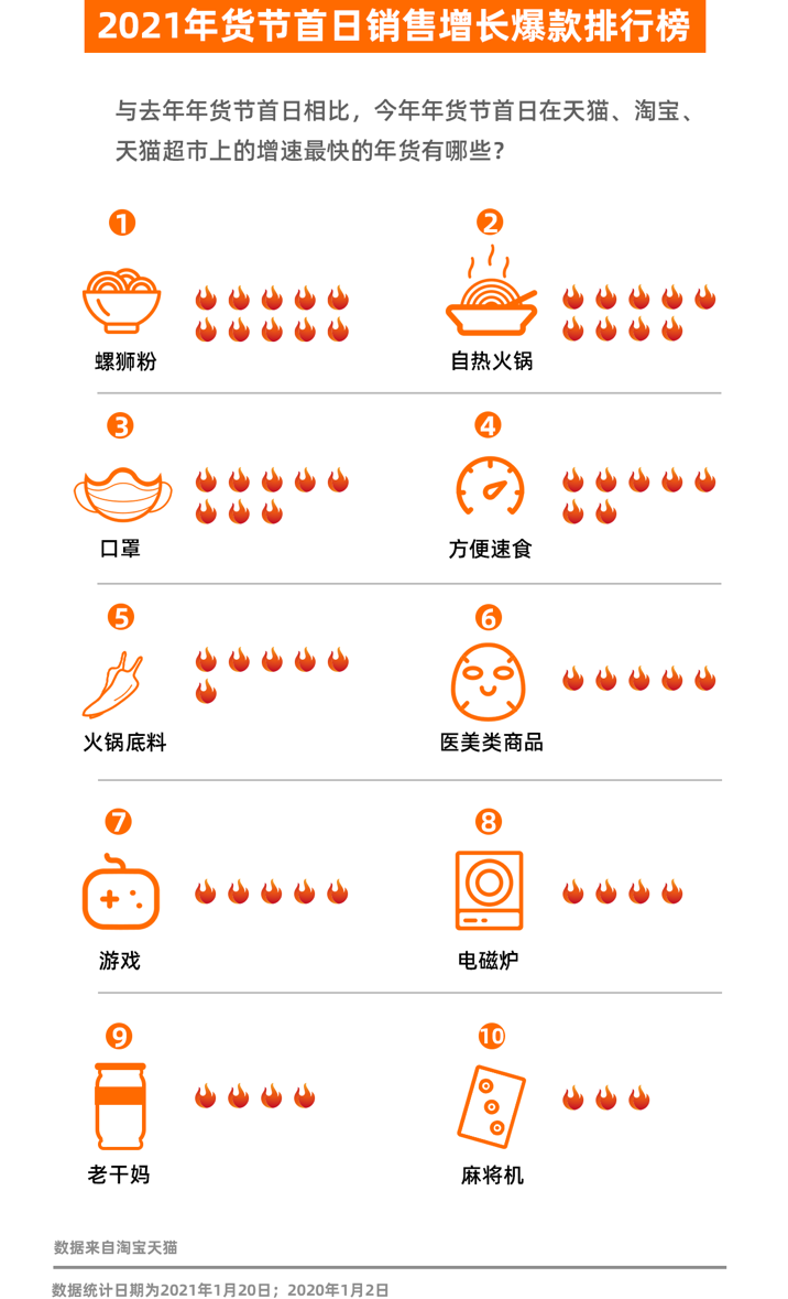 1月20日这一天,有近20万人趁着“年货节”在天猫、淘宝或天猫超市下单了自热火锅,而在去年年货节首日,这个数字还不到2万。此外不少网友还下单了螺狮粉。