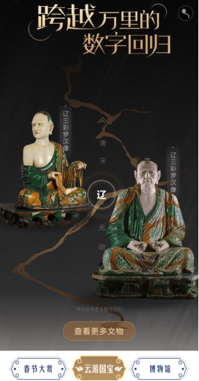此外,小程序还推出了“文物云拜年”的创新玩法。“文物云拜年”精选了三大合作博物馆中,从新石器时期到清朝的15对“兄弟文物”。每一对文物都出自同一朝代、属于同一类型甚至出自同一套系,比如两尊同样来自河北易县的辽代等身三彩罗汉像。15对文物将在线上实现跨地域“相逢”,共同向用户“云拜年”。