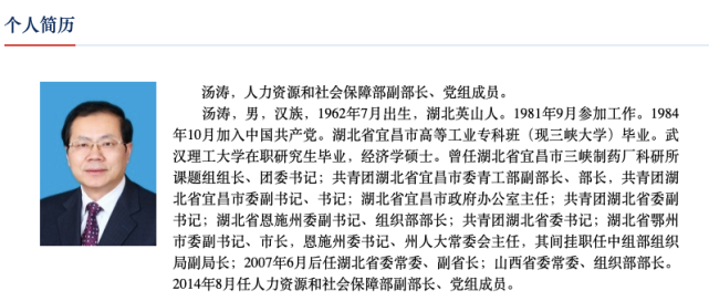 2009年6月,汤涛跨省到山西工作,2014年8月进京,他现任人社部副部长。