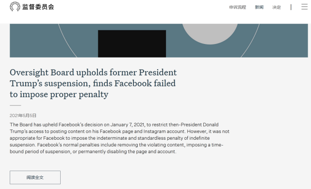 脸书监督委员会维持此前决定:限制特朗普在脸书及Ins账户上发布内容